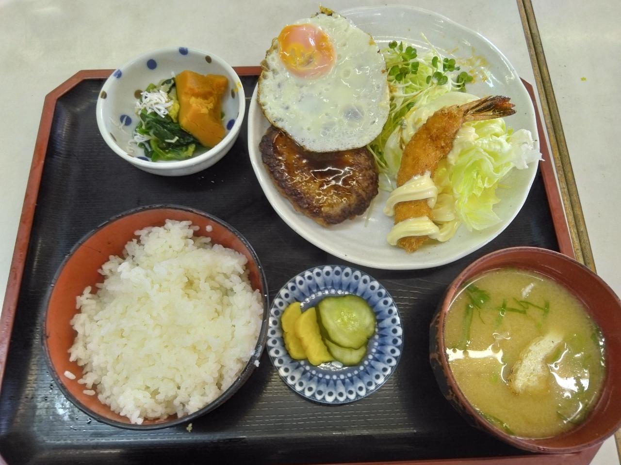 ある日の日替わりランチ2(メイン:ハンバーグ、目玉焼き、エビフライ)
